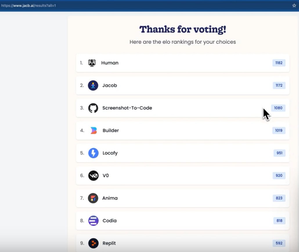 The screenshot shows the results of a "blind" comparison by people of two options for converting design into code: various available tools and a live person