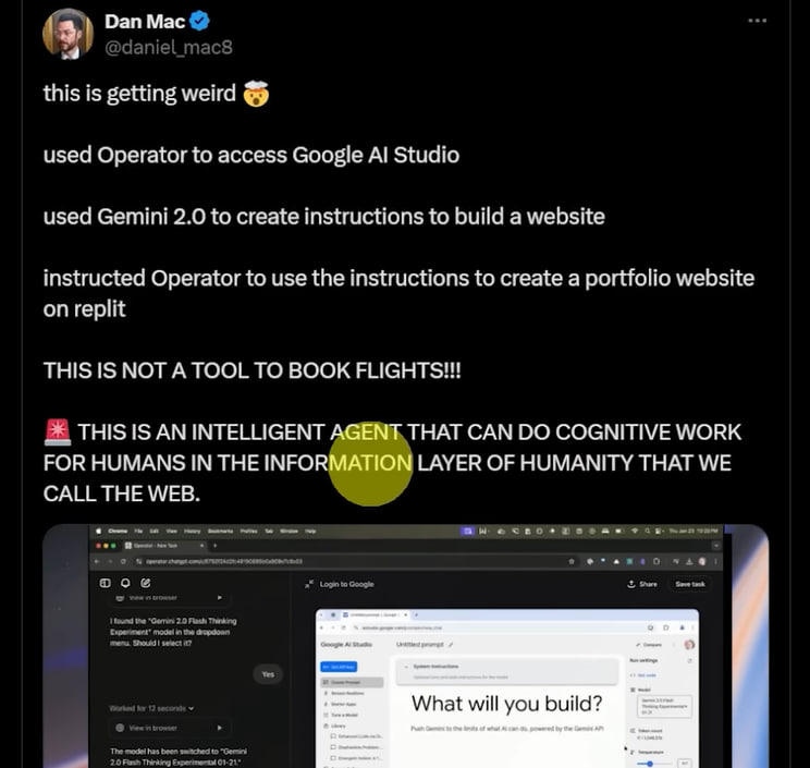 OpenAI agent Operator (news on techcrunch ) via Google AI Google AI Studio and Repl can create a website =)