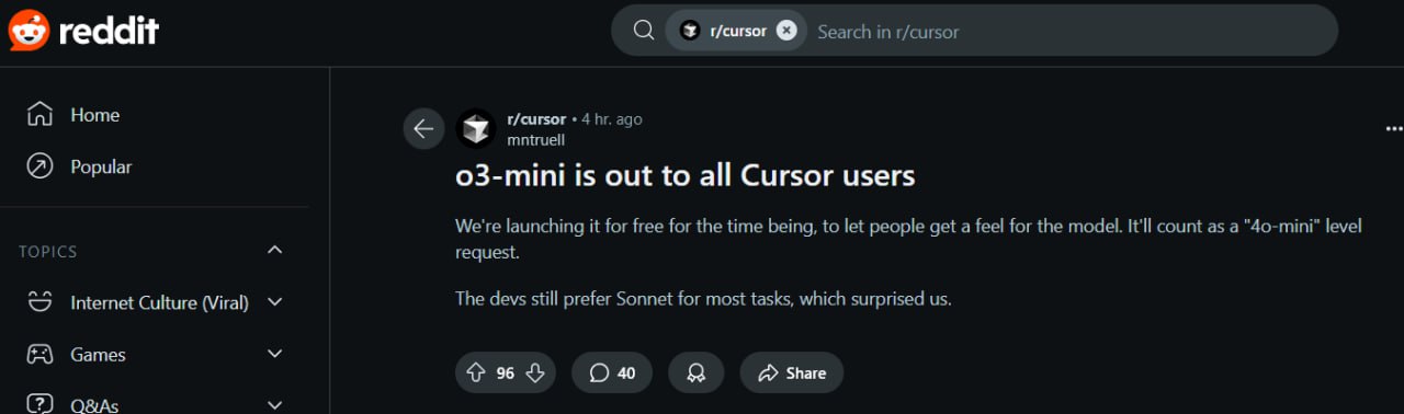 https://www.reddit.com/r/cursor/comments/1ienr72/o3mini_is_out_to_all_cursor_users/?rdt=53528